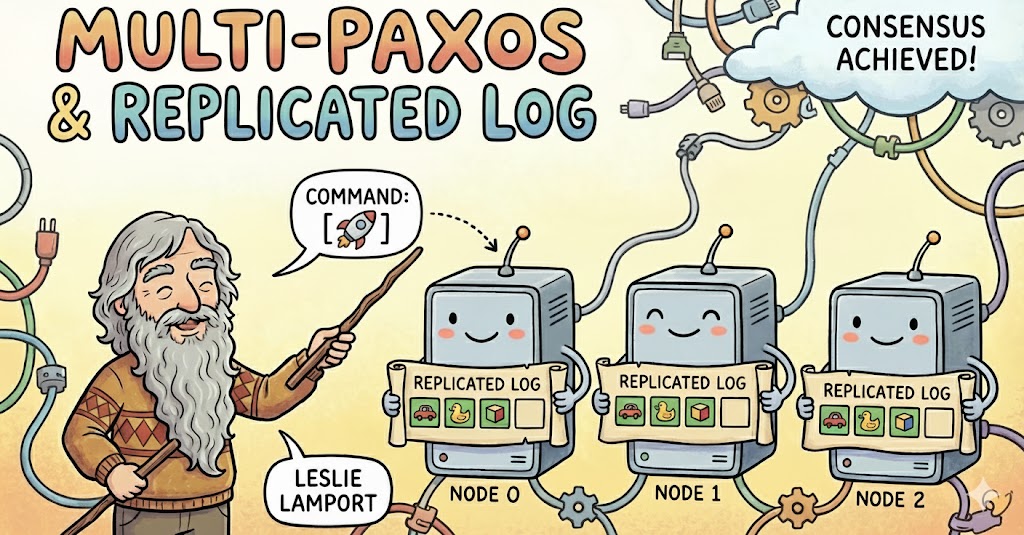 In the previous post we built a compact, 200-line implementation of Lamport’s Paxos algorithm. That implementation did exactly one thing: choose a single value. It demonstrated the core mechanics of Paxos — the roles of proposers, acceptors, and learners; the two-phase protocol; and the safety guarantees that make it such a foundational distributed algorithm.