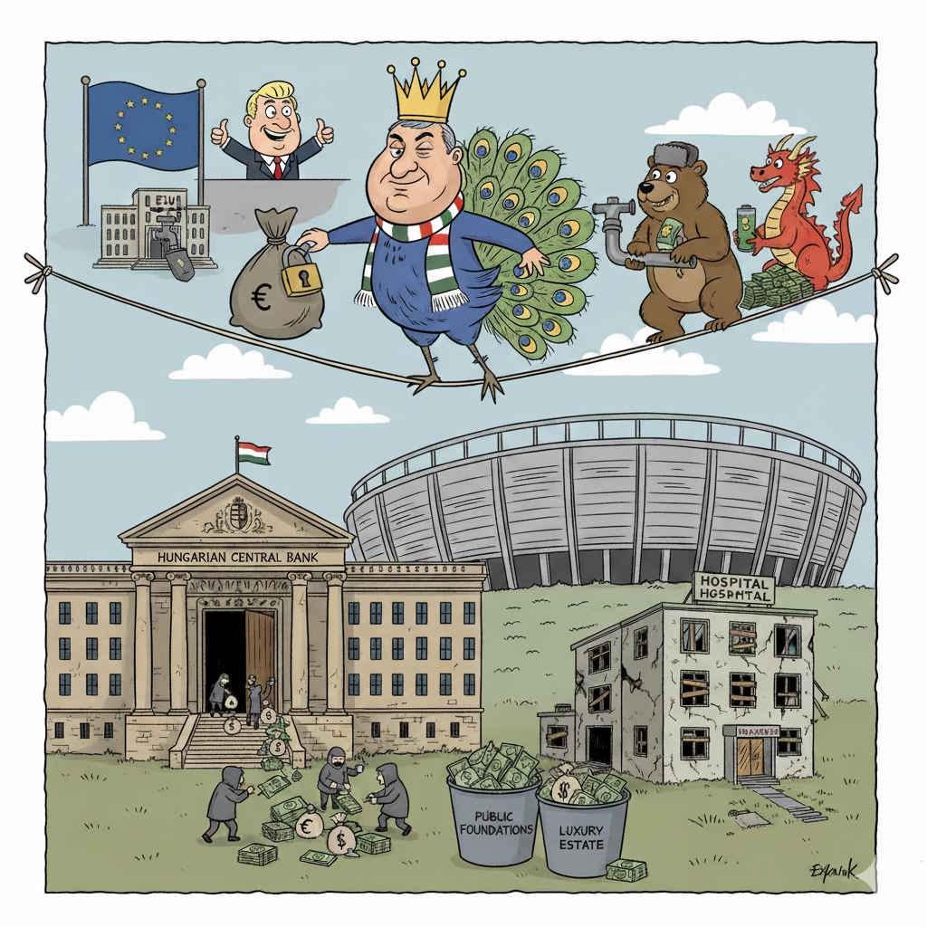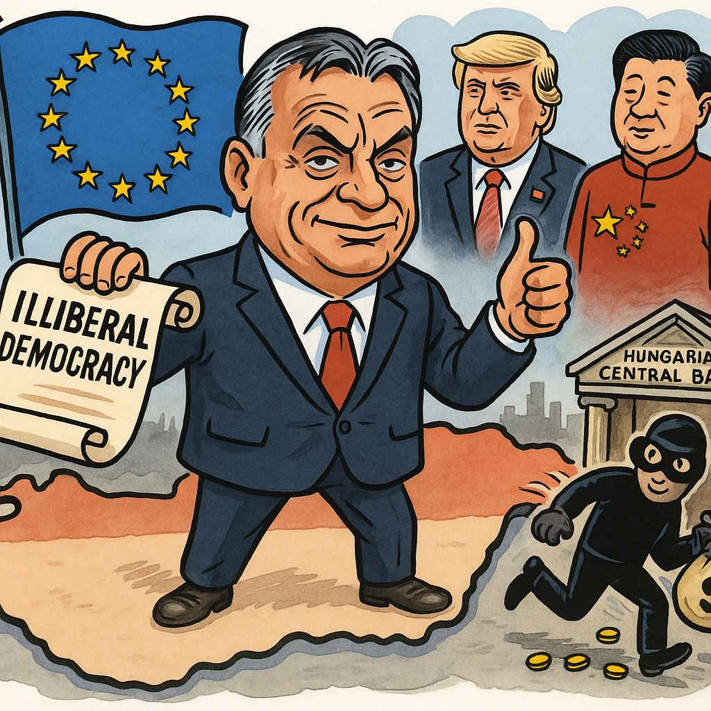 Give me a cartoonish picture that summarizes Viktor Orban's 15 year rule of Hungary. The picture should show the EU, Trump, Putin, China, the Hungarian Central bank's robbery.